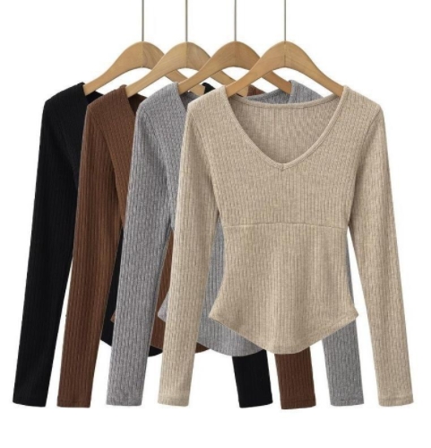 跨境速卖通女装厚料针织大V领修身拼接弧形下摆长袖打底衫针织衫