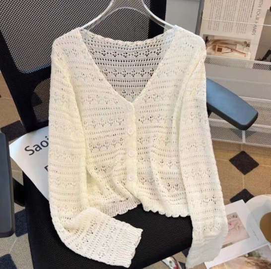 夏季韩版宽松V领镂空百搭针织空调衫女薄款长袖冰丝防晒开衫上衣