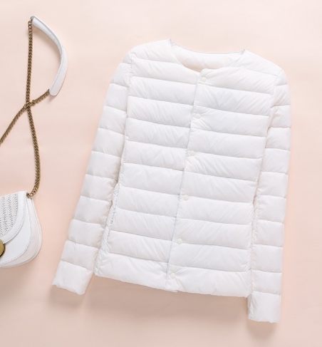 犹家服装秋冬新款女装无领羽绒外套轻薄便捷圆领修身短款女羽绒服