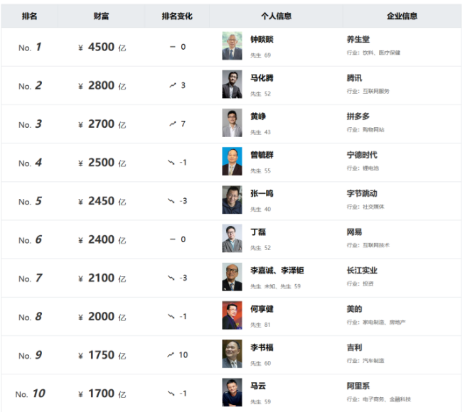 近日,备受瞩目的2023年《胡润百富榜》如期揭晓,再次引发广泛关注。从榜单排名来看,著名企业家农夫山泉的钟睒睒蝉联中国首富,腾讯的马化腾重回第二、拼多多的黄峥一跃成为今年的第三名。胡润百富榜,是中国推出第一份财富排行榜,也是国内财经榜单里影响最大的一个榜单,已经连续发布二十五年,追踪记录了中国企业家群体的变化。