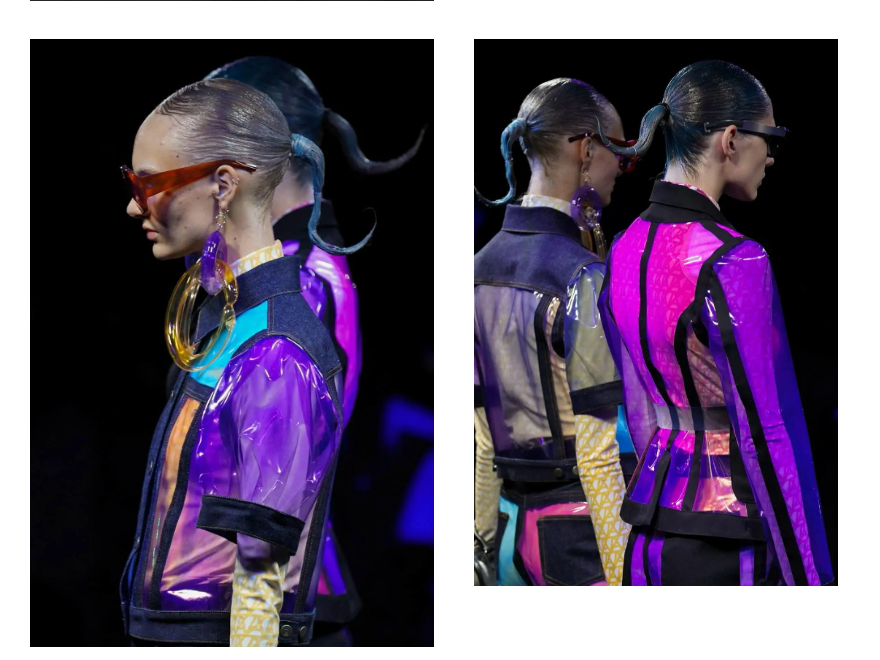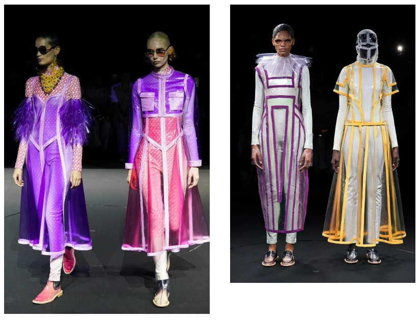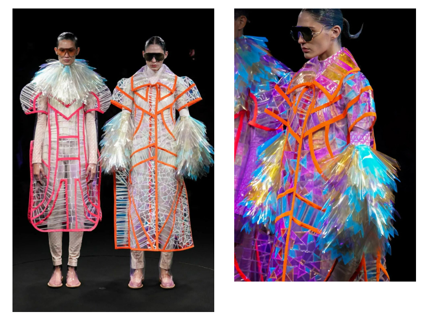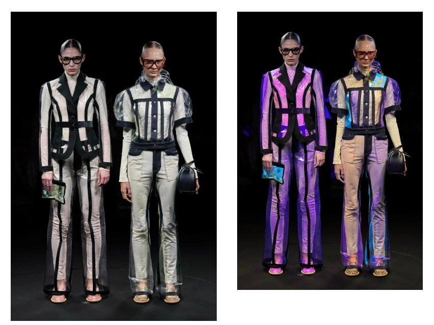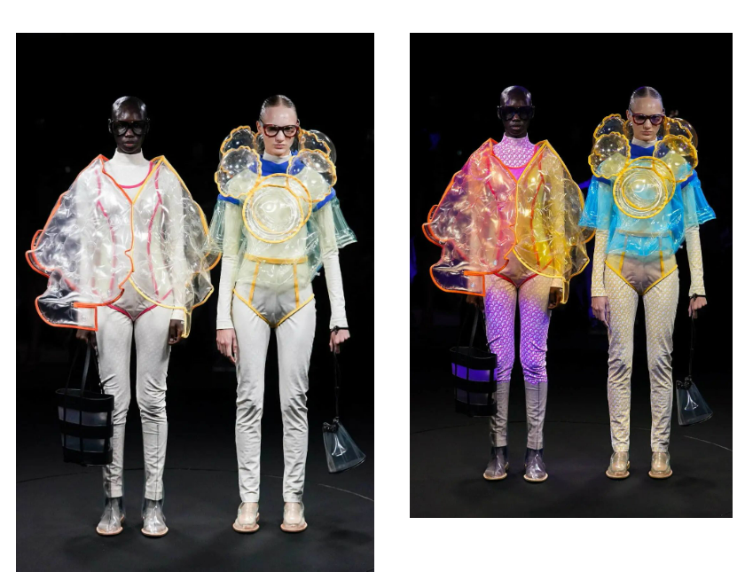 Anrealage每一季发布都会带来不一样的“魔法瞬间”,未来科技感拉满!2024SS Anrealage开发了一种独特的环保光致变色PVC,在紫外线灯和其他灯光照射下,原本透明的 PVC 立即获得丰富立体的色彩视觉体验,制造出一场令人着迷的变色服装秀。