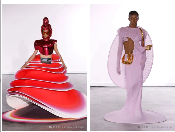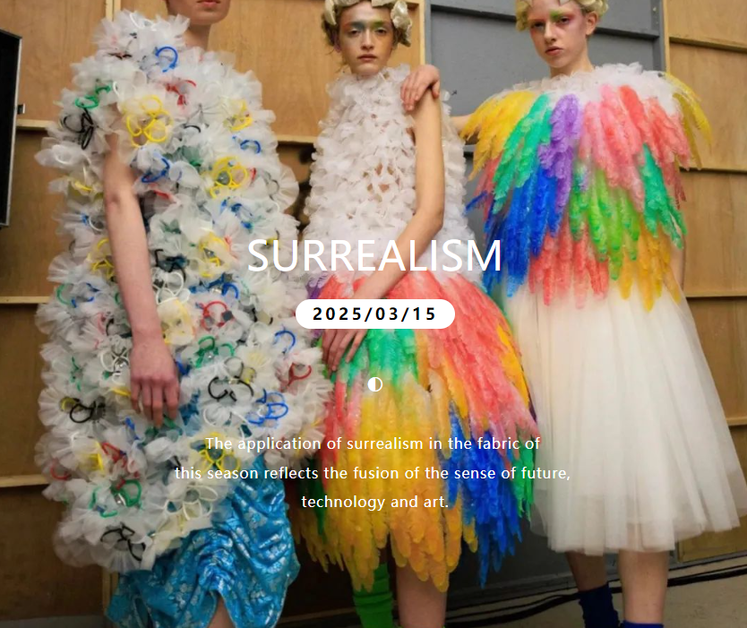 超现实主义起源于19世纪,在吸收了达达主义反传统的观念后又摒弃了其否定一切的观点,形成了独特的纲领。比起传统服装,超现实主义艺术特征的服装在材料选择上有更多的可能性。本季超现实主义在服装面料中的应用,反映了未来感、科技感与艺术感的融合,强调通过创新材质和工艺营造梦幻、虚拟与现实交织的视觉效果。