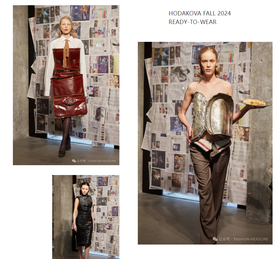 HODAKOVA由设计师 Ellen Hodakova Larsson 于2021年创立,品牌致力于将旧材料转化为奢侈品,通过时间的肖像讲述故事。此次大秀延续着以往的创作思路,展示了腰带拼接而成的连衣裙,不锈钢盒子制作的抹胸,以及利用她父亲的邮差包拆解制作的一条裙子。这些设计融合了超现实主义元素,她的反传统设计思维一直都在颠覆大家对于制衣的看法。
