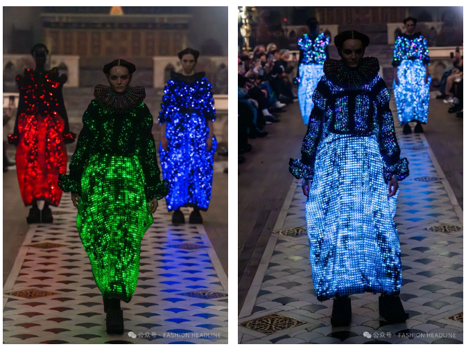 科技感面料是超现实主义服装设计的重要特征之一。通过引入先进的材料和智能技术,设计师们创造出能够动态变化、发光、甚至与环境互动的服装。这些面料不仅赋予服装以未来感,还通过科技与艺术的结合,探索了服装在功能性和表现力上的新边界。Anrealage 的创意总监森永邦彦(Kunihiko Morinaga)总是能带来令人惊叹的奇思妙想。2025 秋冬女装系列发布会,森永邦彦构建了一个充满未来感的时尚世界 —— 在这个世界里,人们只需轻按按钮,便能瞬间更换现实世界中的服装。他将服装转化为闪烁的动态广告牌,别出心裁地运用了由数千个 RGB 色调的 LED 灯勾勒出的丰富图案。这些图案变化多端,从格子图案瞬间切换为条纹图案,而后又再度变回格子,每秒最多可呈现 60 种变化。