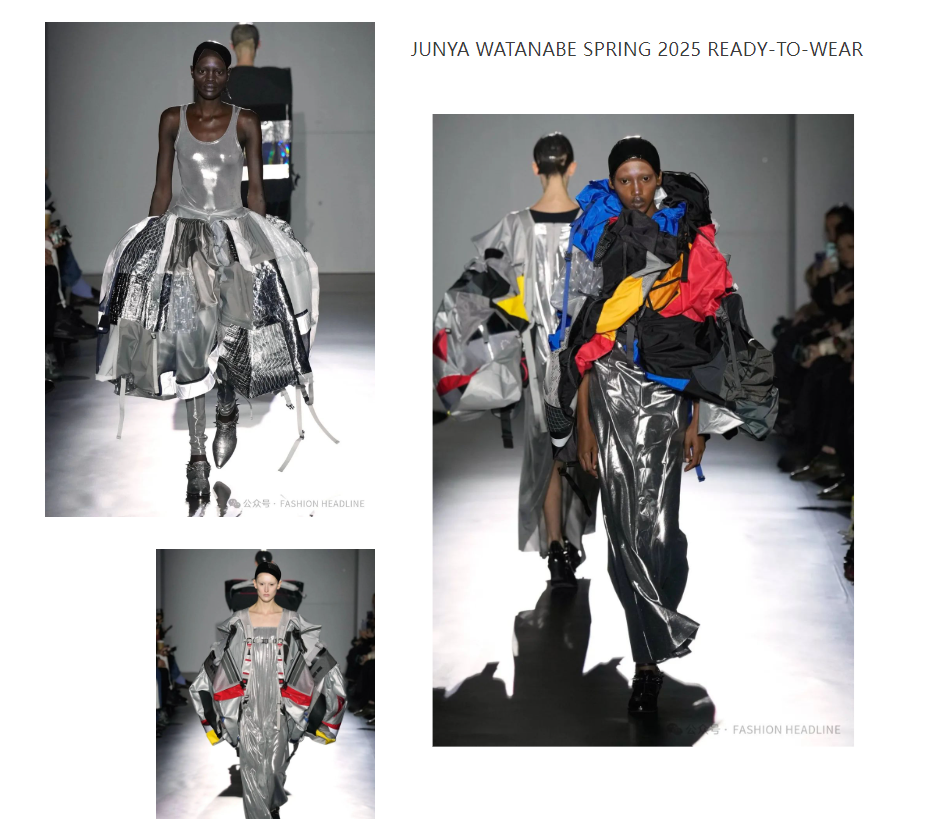 JUNYA WATANABE的2025春夏系列,设计师Junya Watanabe通过独特的视角,探索了“日常”与“非同寻常”之间微妙的平衡。他的设计不仅是服装,更是一种对生活方式的深刻思考,通过对工业设计元素的巧妙运用,让普通的材料焕发出新的生命力与魅力。Junya Watanabe将工业材料——如小轮车和越野摩托车装备、Tyvek 材料、尼龙搭扣带,甚至隔音泡沫融入精致外套和前卫晚礼服之中,创造出一个科幻与高级时尚交织的系列。