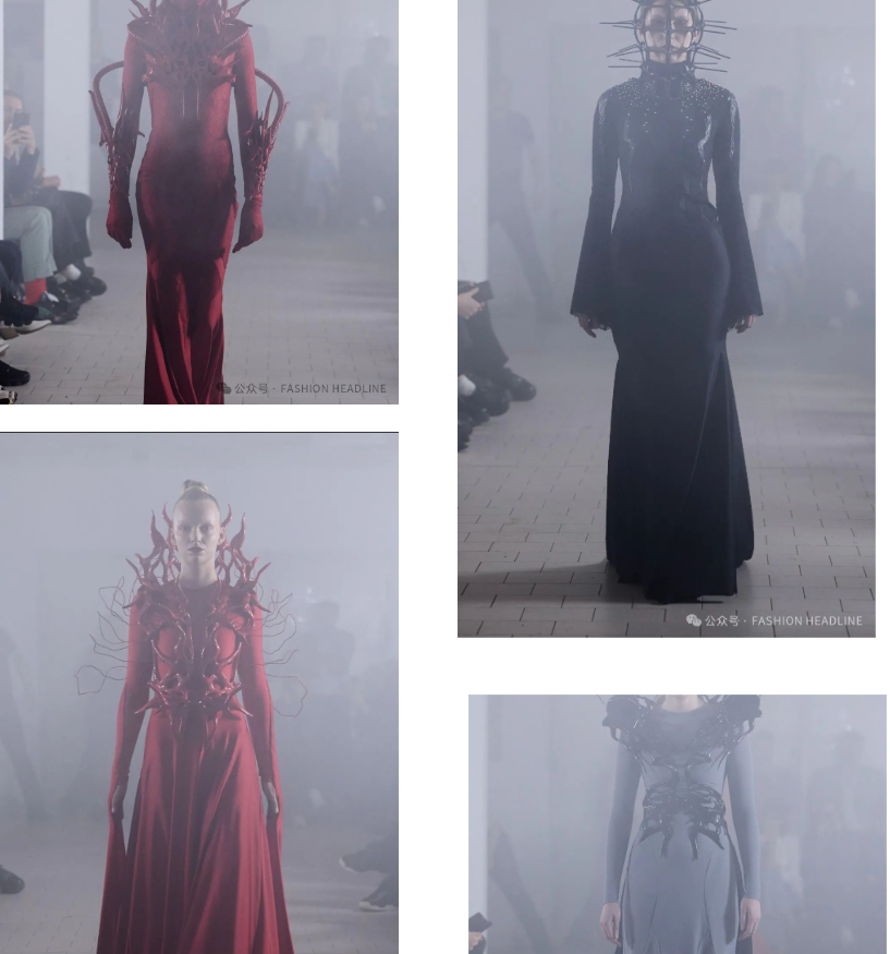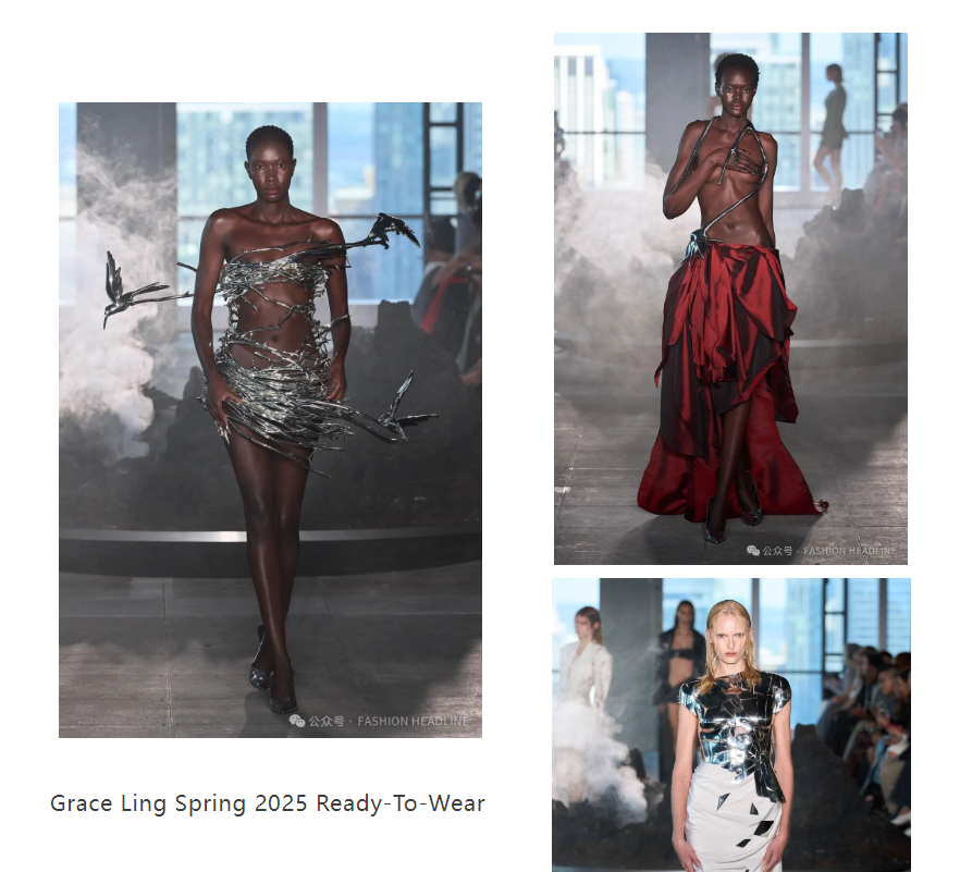 Grace Ling的设计不仅仅是服装,它们是可穿戴的艺术品。特别是她的3D打印设计,不单是技术的展示,更是艺术表达的媒介。比如,本季由Alex Consani开场的铝制胸甲,以“Neanderthal”的方式断裂,这种设计不仅重塑了形式与功能的关系,也让人思考未来时尚与原始形态之间的对话。色彩方面,Ling也大胆地运用了血红色、叶绿色和锈棕色等调色板,与她充满感性和超现实主义的设计风格相得益彰。