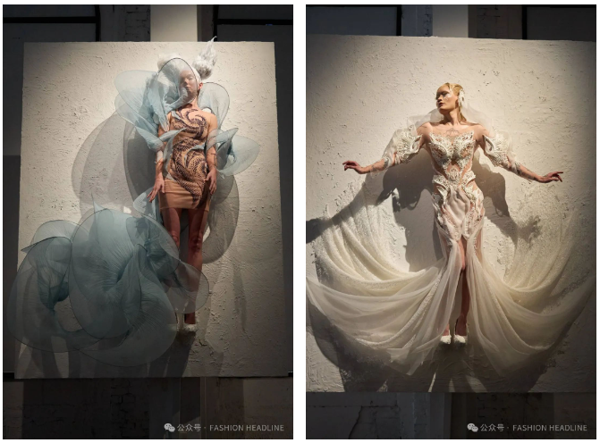透明与半透明材质在服装中的应用,为设计带来了梦幻般的视觉效果,体现了超现实主义对传统视觉的挑战,也展现了服装设计在材质探索上的创新精神。Iris Van Herpen 是来自荷兰的先锋设计师,她的作品以其超现实主义,充满未来感而闻名。本次2024秋冬高定系列这位荷兰设计师再次以其独特的视角和创新手法,将我们带入了一个前所未有的时尚领域。从复杂的褶皱到精细的刺绣,从透明的薄纱到厚重的织物,每一种材质都被巧妙地运用和融合。这些细节不仅仅是装饰,它们构成了服装的语言,讲述着设计师的思想和故事。