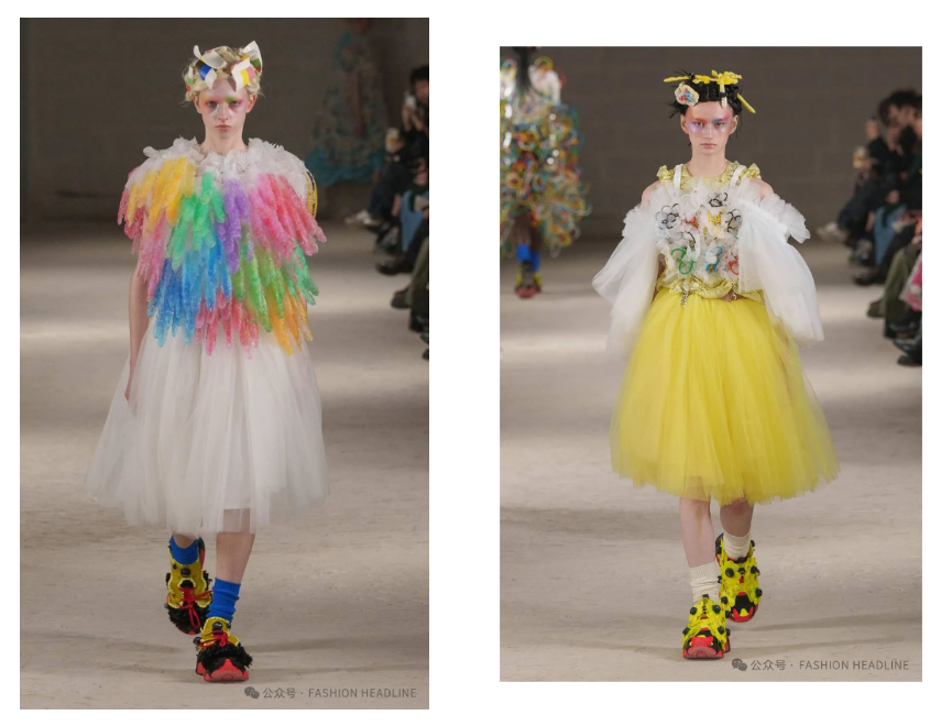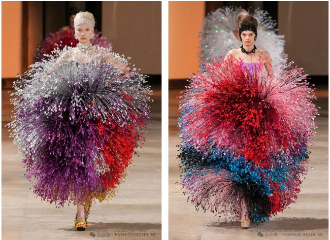 可持续材料在超现实主义服装设计中的应用,反映了当代时尚对环境保护与资源循环利用的深刻关注。通过使用废弃材料、回收纤维等可持续资源,设计师不仅减少了对环境的影响,还赋予了服装新的生命和意义。Germanier 2025SS Germanier 品牌以其极致繁复、色彩艳丽的串珠设计服饰颇受关注,利用废弃材料制作、以可持续环保为亮点。2025年春夏高级定制时装秀上,Kévin Germanier开启了他在高级定制领域的首次尝试。从手工串珠的细腻到拉菲亚(Raffia)精心梳理并形成类似羽毛的形式,每一件作品都可持续的践行,凝聚着匠人的智慧与情感。
