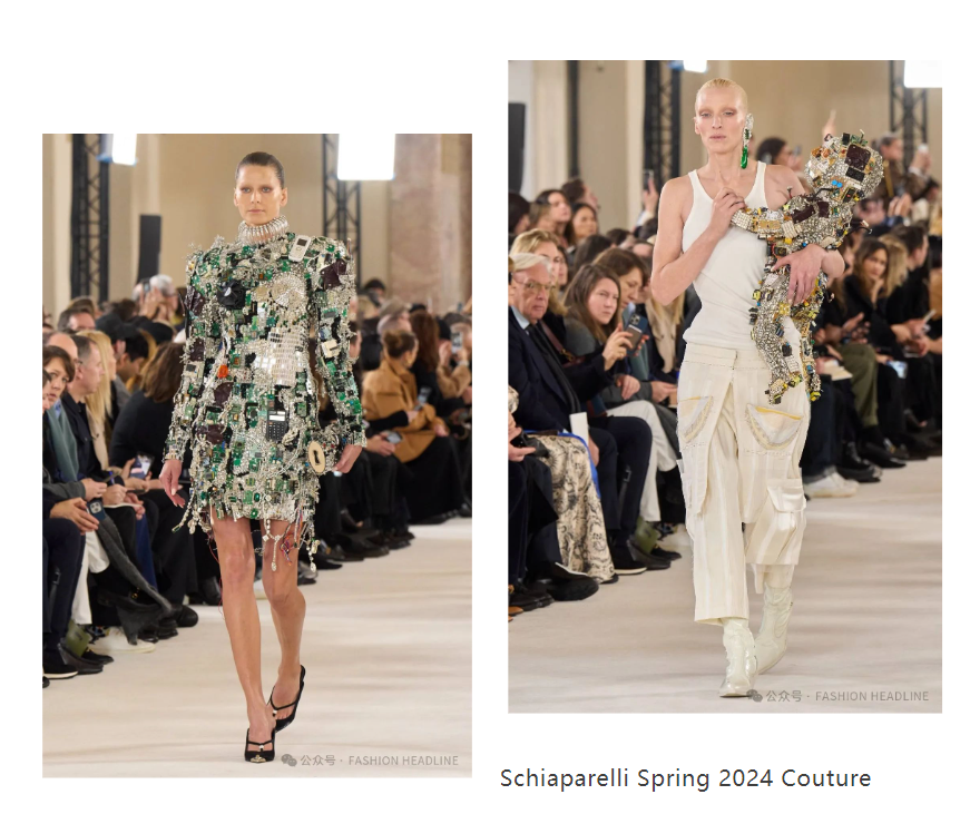 Schiaparelli这个有着超现实主义基因的品牌,2024春夏高定系列以“科技”为内核,营造出一个个诡谲又华丽的look,再一次给观众打造一个值得深思的时装造梦空间。其中,模特 Maggie Maurer 抱着一个机器人婴儿走入秀场,婴儿和连衣裙都由怀旧的科技元素组成的闪闪发光的结构,比如废弃的电子主板、cd、翻盖手机、镜子和宝石等。