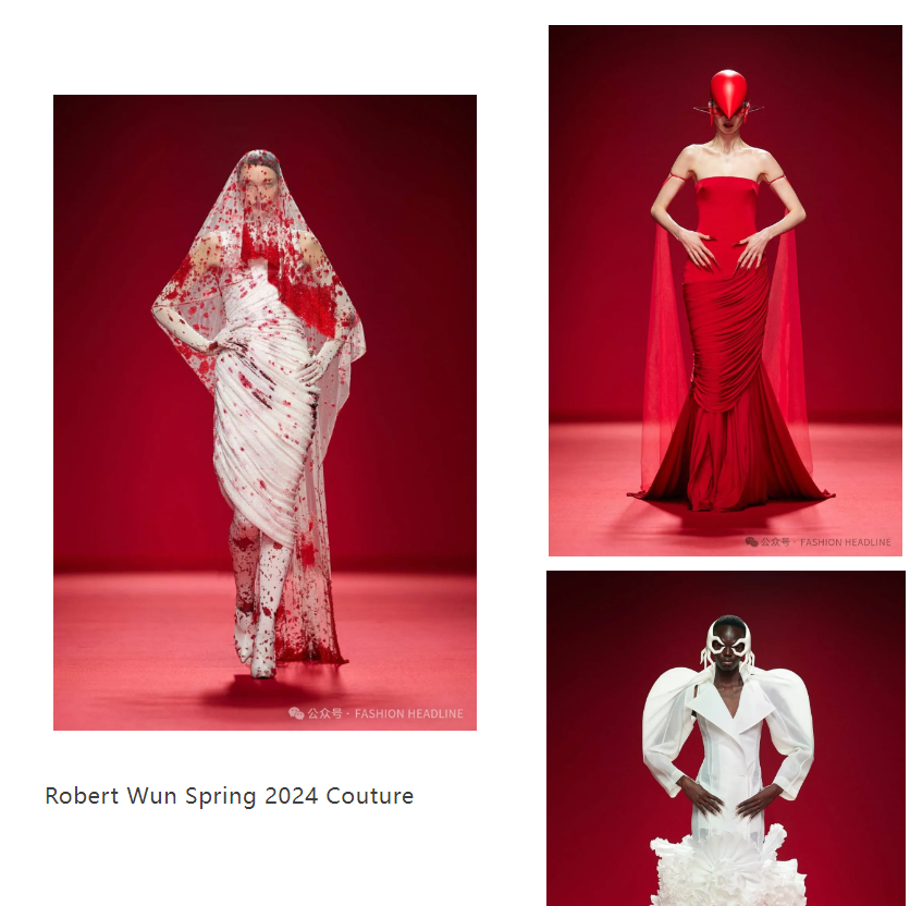 Robert Wun2024春夏高定系列不乏令人惊叹的诡异、血腥的造型。其中,“Bloody Bride”这一造型,凭借与正统新娘形象巨大的反差和冲突,在社交媒体掀起了热议。Wun用象征暴力的鲜血为新娘加冕,搭配相应数量的红色水晶进行精准缝纫。一系列带有褶皱细节的袖口和裙摆呼应着Robert Wun过往成衣系列中的经典造型,而超现实的手模造型头饰,也为整场大秀增添了超现实主义的色彩。