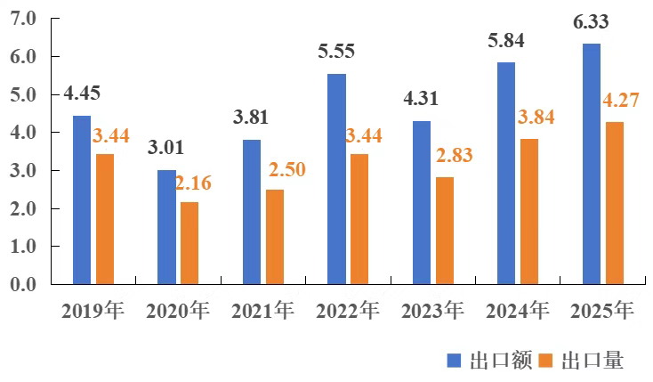 图2 我国锦纶长丝织物2019年~2025年1~6月同期出口量额(亿米/亿美元)