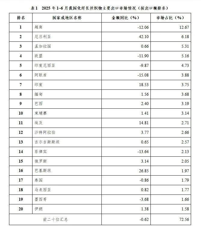 表12025年1~6月我国化纤长丝织物主要出口市场情况(按出口额排名)