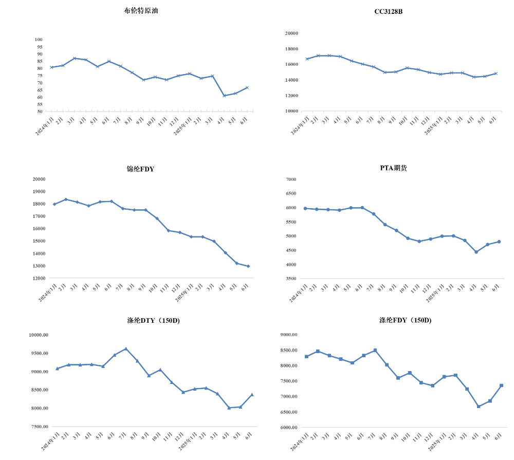 为我国主要化纤长丝、棉花、PTA期货及布伦特原油价格走势变化情况。2025年上半年,受贸易摩擦升级、地缘局势紧张等因素影响,原油价格波动较大,四月布伦特原油收盘价跌至61美元/桶,之后反弹,六月收盘价上涨至66.6美元/桶。上半年,PTA市场价格跟随原油震荡,呈“高位震荡-跌后反弹”的走势,1~3月价格处在高位,4月份价格跌至近两年内的最低点4434元/吨,5~6月行情反弹。化纤主要产品跟随原油呈现先降后升的走势。涤纶DTY/FDY(150D)价格1~4月呈震荡下行走势,5月伴随着上游原料收缩减产,叠加中美日内瓦谈判带来的利好,价格止跌反弹。2025年以来锦纶FDY总体呈下行趋势,跌幅较明显,6月底价格较1月底下跌约15.5%。图1 2024年1月~2025年6月我国化纤长丝、棉花、PTA期货及布伦特原油价格走势单位:美元/桶、元/吨