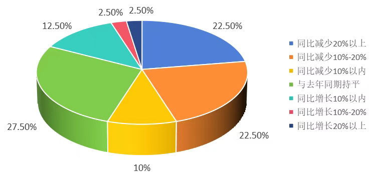 2025年以来,国内宏观经济形势总体平稳、全国各地消费品以旧换新政策加力扩围、促消费政府发力显效,纺织品服装内销总体实现温和增长。根据国家统计局数据,2025年1~6月全国限额以上服装、鞋帽、针纺织品类商品零售额同比增长3.1%;网上穿类商品零售额累计同比增长1.4%。从中国轻纺城的交易量来看,2025开年市场景气程度回升,“金三银四”期间,春季新风格坯布和常规坯布成交价量呈现一定幅度上涨走势。5~6月,因下游需求不足,市场景气指数环比下跌,坯布类成交价量出现下滑。企业内销订单增长承压。根据协会调查问卷结果显示,17.5%的长丝织造样本企业2025年上半年内销订单较去年同期增长,其中内销订单同比增长了20%以上的企业仅有一家,该企业主营产品为防寒服、冲锋衣等户外运动面料;27.5%的企业内销订单与去年持平。(图3)此外,调查结果显示,上半年企业订单以中单(1~3个月)、短单(1个月内)为主,中单占比50%,短单占比47.5%,长期订单不足,企业订单结构短期化、碎片化,反映出市场需求依然存在不确定性。图3 长丝织造企业2025年上半年内销订单同比情况(%)