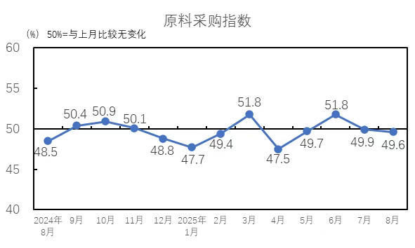 2025年8月,原料采购指数为49.6%,低于临界点,较7月下降0.3个百分点。棉花方面,需求端在“旺季将临”预期下微幅边际好转,叠加ICE 期货价格上涨提振,导致郑棉价格走势偏强,下半月市场传言新棉预售较多,对新棉是否仍有抢收也较为关注,多空双方陷入僵持,盘面较为谨慎克制,期现价格持续区间调整。涤纶短纤方面,受国际原油价格影响,涤纶短纤价格上半月窄幅波动,下半月先涨后跌。粘胶短纤方面,产业链交投气氛回暖,粘胶短纤报价陆续提升,价格上涨。据TTEB数据,国内3128级棉花现货月均价15042元/吨,环比下降89元/吨,降幅0.59%;1.4D直纺涤短月均价6589元/吨,环比下降110元/吨,降幅1.64%;主流粘胶纤维月均价12869元/吨,环比上涨158元/吨,涨幅1.24%。从采购量看,8月棉花采购上升,非棉纤维采购下降。棉花采购指数51.1%,较7月上升2.6个百分点,高于临界点;非棉纤维采购指数48.3%,较7月上升0.4个百分点,低于临界点。