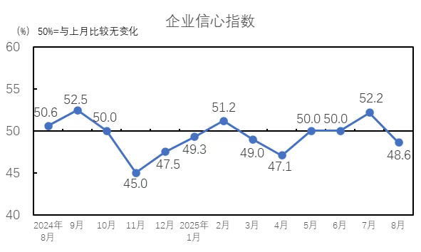 2025年8月,企业信心指数为48.6%,较7月下降3.6个百分点,企业信心指数低于临界点,对未来市场的信心下降。8月份,随着传统旺季的临近,市场情况得到好转,但好转程度有限,未能达到企业对传统旺季的期待,企业对后续市场的预期下降,对未来市场的信心降低。