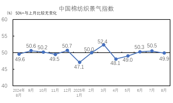 2025年8月,生产指数为49.9%,低于临界点,较7月下降0.1个百分点,纺织企业生产情况较7月下降。从分项指数看,棉纺织企业设备开台率指数为49.3%,低于临界点,较7月下降1.1个百分点。纱产量指数为51.1%,较7月上升1.5个百分点;布产量指数为49.4%,较7月下降0.2个百分点;纱产量指数高于临界点,布产量指数低于临界点。