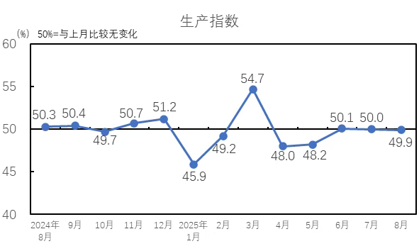 全球制造业恢复力度有所上升。根据中国物流与采购联合会公布的全球制造业采购经理指数,2025年8月份全球制造业PMI为49.9%,较上月上升0.6个百分点,接近50%的荣枯线。全球制造业PMI较上月有所上升,连续6个月运行在50%以下,本月接近50%的荣枯线,意味着全球制造业虽未改变弱势恢复态势,但恢复力度较上月有所上升。中国制造业采购经理指数小幅回升。国家统计局服务业调查中心和中国物流与采购联合会发布的2025年8月份中国制造业采购经理指数为49.4%,较上月上升0.7个百分点,景气水平较上月有所改善。