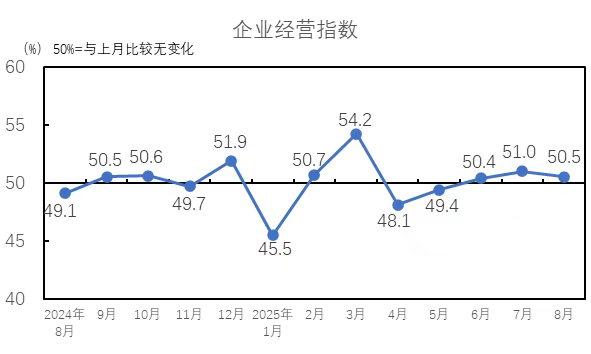 2025年8月,企业经营指数为50.5%,高于临界点,较7月下降0.5个百分点。8月份,随着传统旺季的临近,市场情绪转暖,下游补库意愿增强,纺织企业利润情况得到改善,企业经营指数继续好转。从构成企业经营指数的分项指标看,营业收入指数为50.0%,与7月持平;利润总额指数为50.9%,较7月上升1.0个百分点,营业收入指数处于临界点,利润总额指数高于临界点。