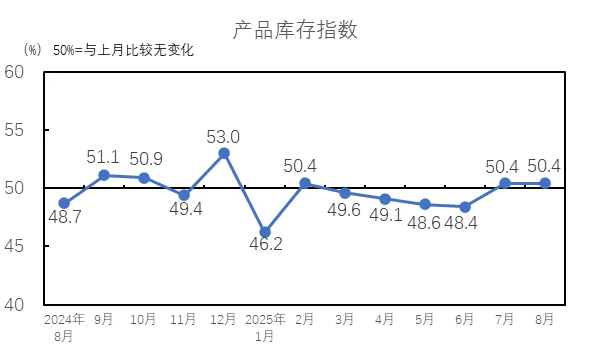 2025年8月,产品库存指数为50.4%,高于临界点,与7月持平,纺织企业产品的库存量维持上月水平。纱库存量指数为50.0%,较7月下降0.7个百分点;布库存量指数为51.0%,较7月上升1.0个百分点。纱库存量指数处于临界点,布库存量指数高于临界点。