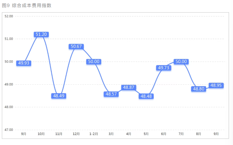 9月,专业市场商户销售总量和盈利增加的占比均为51.05%,较上期上升39.05个百分点;40.56%的市场商户销售价格增加,较上期上升28.56个百分点。整体来看,9月纺织服装专业市场的商户销量指数、盈利指数与平均售价指数均实现显著提升,反映出商户整体经营业绩持续向好。4、商户综合成本费用和库存压力小幅降低