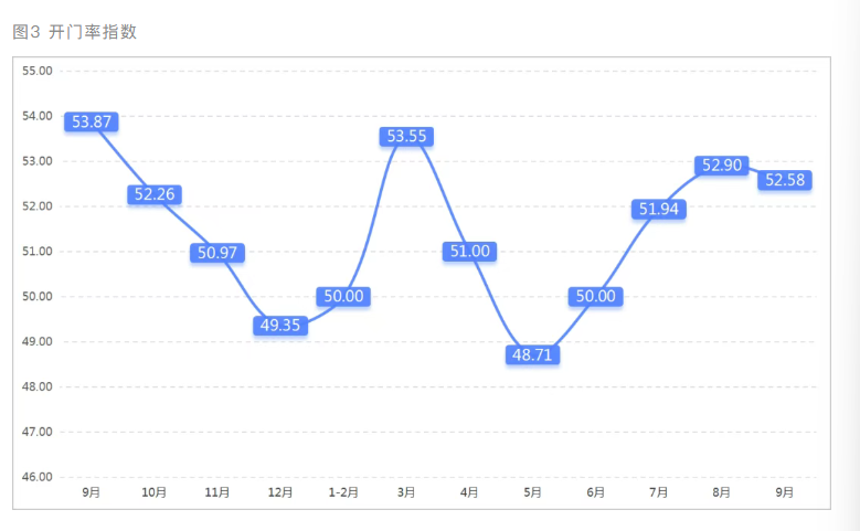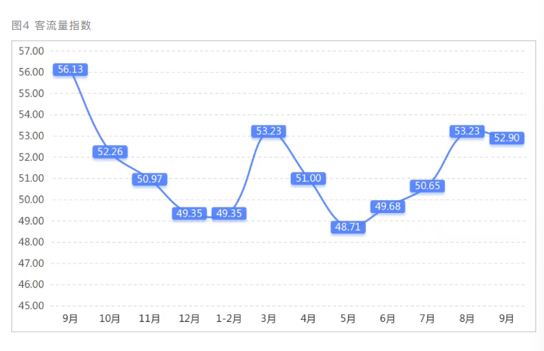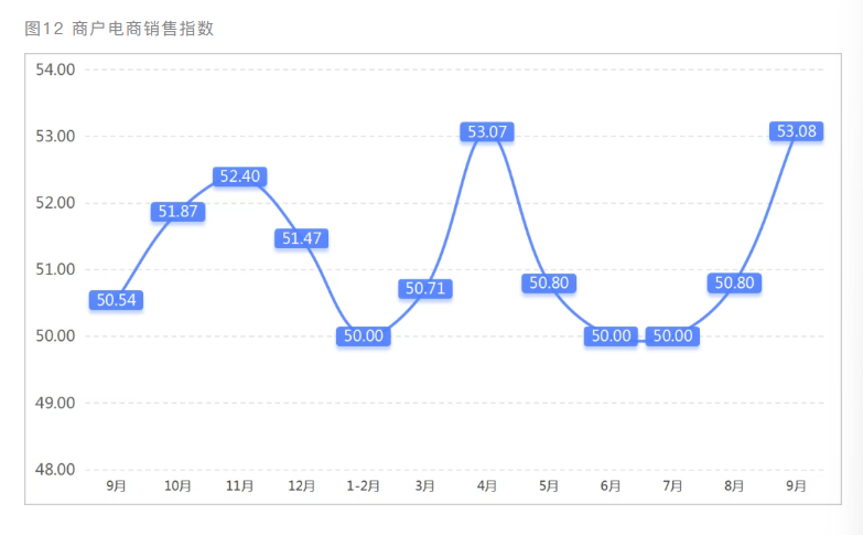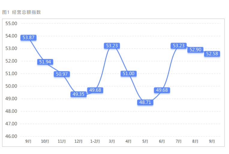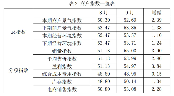 从商户景气指数来看,总指数中,9月商户景气指数为52.69,较上期上升2.39个百分点;经营环境指数为53.57, 较上期上升1.10个百分点。