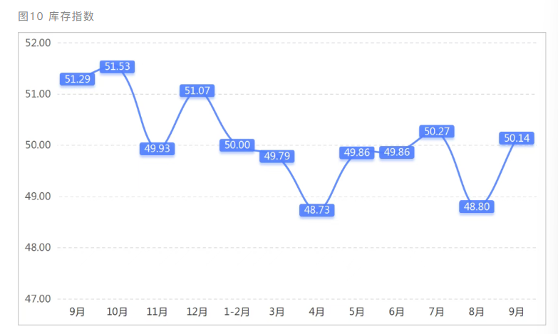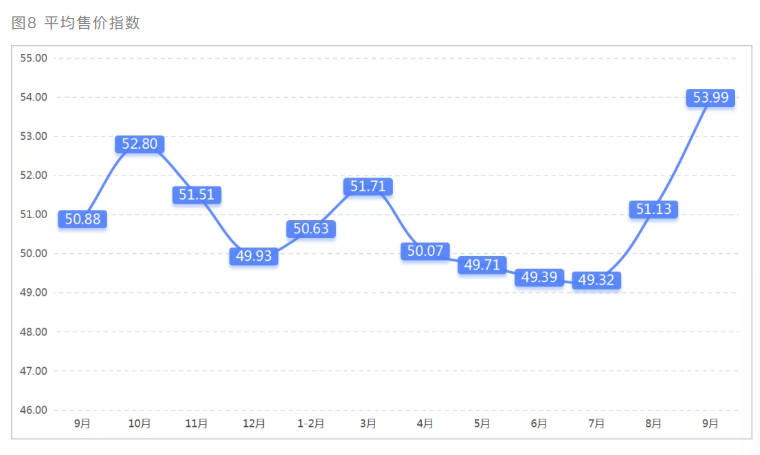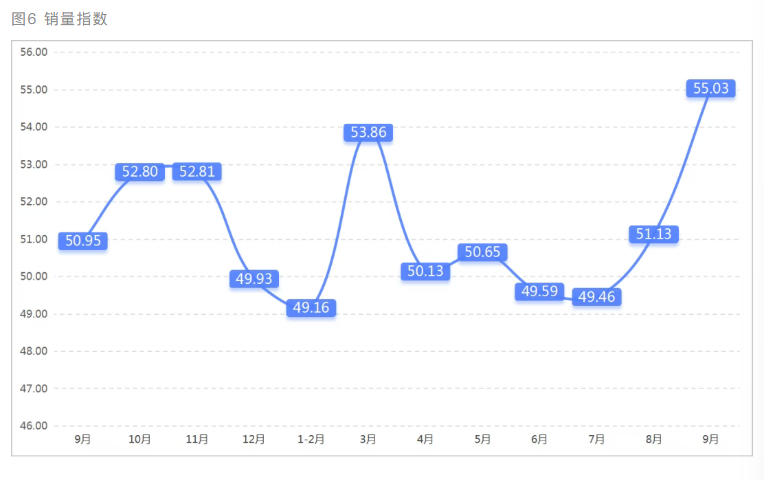 分项指数中,销量指数为55.03,较上期上升3.90个百分点;平均售价指数为53.99,较上期上升2.86个百分点;盈利指数为54.97,较上期上升3.84个百分点;综合成本费用指数为48.95,较上期上升0.15个百分点;库存指数为50.14,较上期上升1.34个百分点;电商销售指数为53.08,较上期上升2.28个百分点。