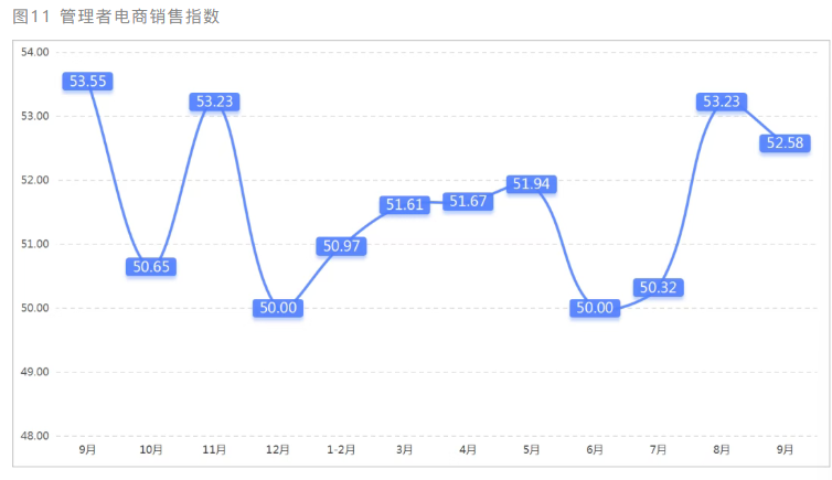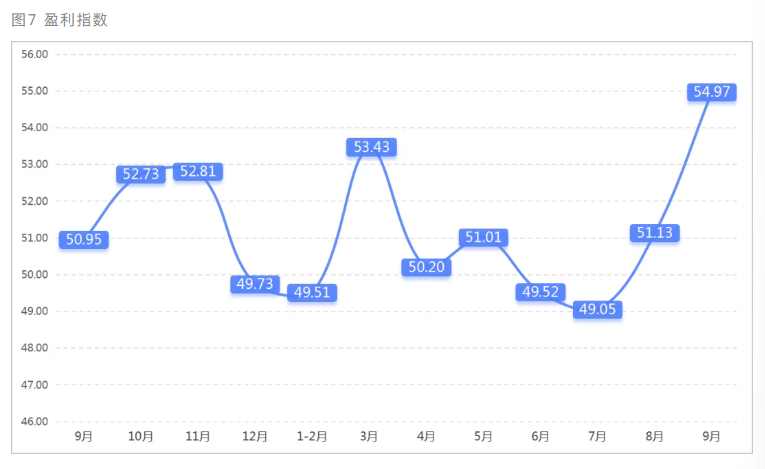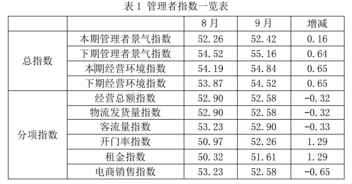 从管理者景气指数来看,总指数中,9月管理者景气指数为52.42,较上期上升0.16个百分点;经营环境指数为54.84,较上期上升0.65个百分点。