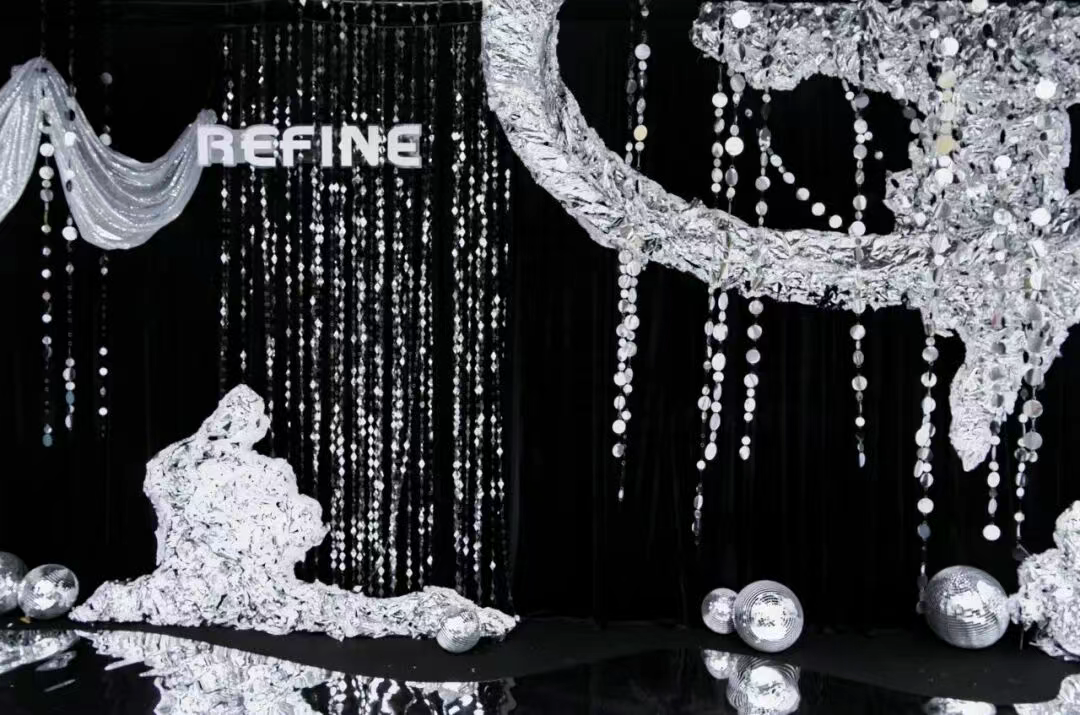 “黑色不只是黑色,它是态度,是氛围,是身体的语言。”REFINE立范的设计团队这样形容2025秋季系列。整场秀以黑色为主调,却在极繁主义的装饰下绽放出摩登、大胆、甚至略带“Mob Wife美学”的张力。贴身剪裁、亮片串饰、金属细节......服装成为女性自我表达的媒介,打破传统审美对“优雅”的单一想象。秀场空间的银黑装置同样引人注目:垂坠的亮片如星光倾泻,镜面球与金属花艺错落其间,构建出一个既梦幻又具象的视觉现场。这不是一场遥不可及的秀,而是可触摸、可共鸣的美学体验。