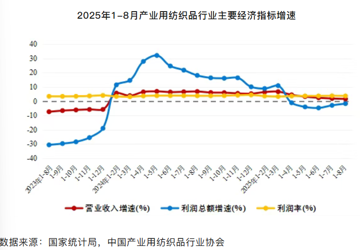 2025年1-8月,世界经济在地缘政治冲突加剧、关税冲击、产供链碎片化等多重挑战中艰难前行,全球经济增长动能减弱;我国经济总体保持平稳增长态势,但增速呈现温和放缓趋势,工业生产保持较快增长、消费增速放缓、出口韧性较强但仍面临挑战。我国产业用纺织品行业运行整体平稳,工业增加值增速有所放缓。生产方面,根据国家统计局数据,1-8月规模以上企业的非织造布产量同比增长4.5%;帘子布的产量同比下降5.6%。经济效益方面,根据国家统计局数据,1-8月产业用纺织品行业规模以上企业的营业收入同比增长1.6%,利润总额同比下降1.7%,利润降幅连续两个月收窄;营业利润率为3.7%,同比下降0.1个百分点。分领域看,1-8月非织造布规模以上企业的营业收入和利润总额分别同比增长2.8%和7.4%,营业利润率为2.9%,同比增长0.1个百分点;绳、索、缆规模以上企业的营业收入和利润总额分别同比增长11.1%和2.8%,营业利润率为3.3%,同比下降0.3个百分点;纺织带、帘子布规模以上企业营业收入和利润总额分别同比增长4.8%和15.7%,营业利润率为3.2%,同比增长0.3个百分点;篷、帆布规模以上企业的营业收入和利润总额分别同比下降4.5%和14.1%,营业利润率4.3%,同比下降0.5个百分点;其他产业用纺织品(包括过滤、土工用纺织品等)规模以上企业营业收入和利润总额分别同比下降1.7%和9.8%,5.6%的营业利润率为目前行业最高水平。