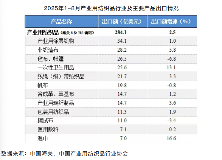 国际贸易方面,根据中国海关数据(海关8位HS编码统计数据),2025年1-8月我国产业用纺织品行业的出口额为284.1亿美元,同比增长2.5%;行业进口额为35.9亿美元,同比增长3.5%。分产品来看,2025年1-8月,行业最大出口产品产业用涂层织物的出口额为34.1亿美元,同比增长1%;非织造布的出口额位居行业第二,达到28.2亿美元,同比增长5.8%,同期出口量为110.8万吨,同比增长12.2%;毡布/帐篷的出口额为26.5亿美元,同比下降6.8%;一次性卫生用品(尿裤、卫生巾等)的出口额为25.6亿美元,同比增长13.1%;其他重点产品方面,产业用玻纤制品、线绳(缆)带纺织品、包装用纺织品和革基布的出口额分别同比增长3.6%、3.3%、1.9%和1.2%;擦拭类产品方面,擦拭布(不含湿巾)的出口额为11亿美元,同比下降3.4%,湿巾出口额达到7亿美元,同比增长16.6%。