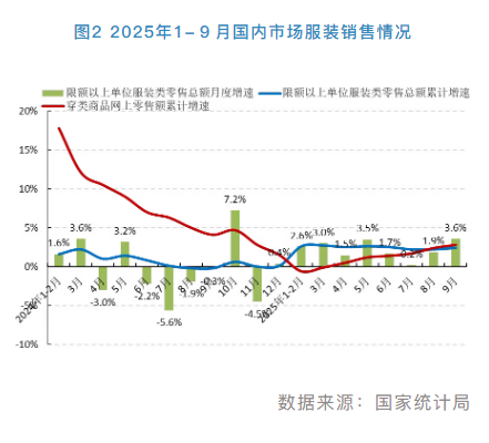今年以来,在国家提振消费政策发力显效、居民消费信心逐步回升等积极因素支撑下,服装内销市场保持温和增长,网络零售渠道呈现改善向好趋势。根据国家统计局数据,1-9月,我国限额以上单位服装商品零售额累计7590.2亿元,同比增长2.4%,增速比2024年同期提升2.6个百分点;直播带货、社交电商等业态模式持续激活消费,穿类商品网上零售额同比增长2.8%,增速比1-6月加快1.4个百分点。