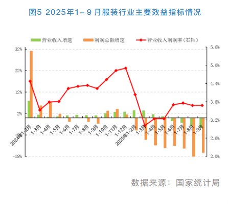 前三季度,受需求偏弱、竞争加剧、成本上涨等因素交织影响,我国服装行业运行质效严重承压,营业收入增速持续回落,利润总额大幅下降,企业盈利能力显著削弱。根据国家统计局数据,1-9月,我国服装行业规模以上(年主营业务收入2000万元及以上)企业13673家,实现营业收入8685.18亿元,同比下降4.63%,增速比2024年同期下滑5.65个百分点;利润总额319.23亿元,同比下降16.19%,降幅比2024年同期扩大13.57个百分点;营业收入利润率为3.68%,低于2024年同期0.51个百分点。