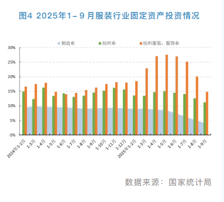 今年以来,随着国家“两重”“两新”政策加力扩围,服装企业加快推动高端化、智能化、绿色化转型升级,扩大技术改造、品牌建设、渠道布局等领域投资,行业固定资产投资增速虽小幅放缓,但仍延续了2024年以来的较快增长态势。根据国家统计局数据,1-9月,服装行业实际完成投资同比增长14.8%,增速比2024年同期放缓1.5个百分点,分别高于制造业和纺织业10.8和3.6个百分点。