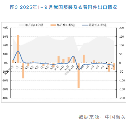 前三季度,受国际市场需求疲弱、美国关税政策变化等多重因素影响,我国服装出口持续负增长。同时由于前期“抢出口”效应减退,三季度出口降幅明显加深。根据中国海关数据,1-9月,我国累计完成服装及衣着附件出口1152.1亿美元,同比下降2.5%,降幅比上半年扩大2.3个百分点,比2024年同期扩大0.9个百分点。从量价关系来看,服装出口延续量升价跌态势,出口数量为267.5亿件,同比增长5.9%;出口平均单价3.6美元/件,同比下降7.5%。从月度出口看,上半年各月服装出口增速波动下滑,三季度转为持续负增长,7月出口金额同比下降0.3%,8月、9月出口降幅达10.0%和8.0%,出口数量增速也由上半年的8.7%降至三季度的1.3%。