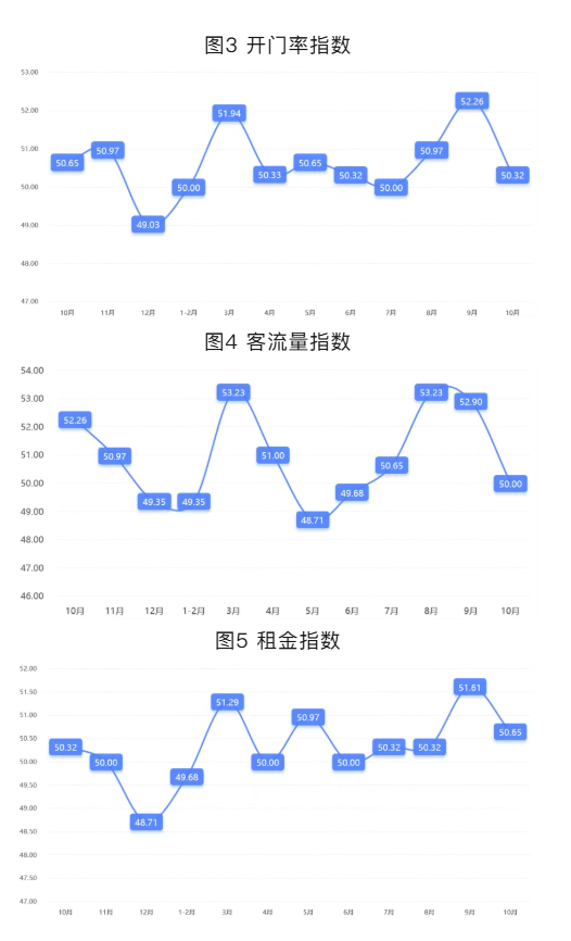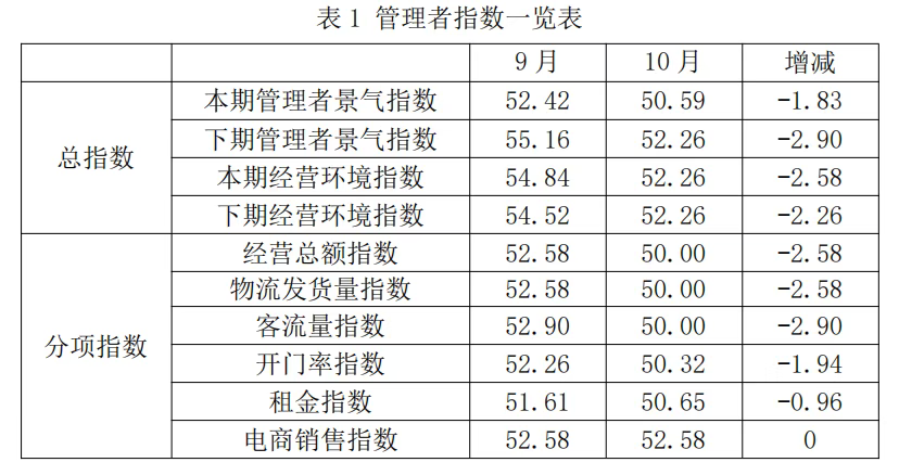 从管理者景气指数来看,总指数中,10月管理者景气指数为50.59,较上期下降1.83个百分点;经营环境指数为52.26,较上期下降2.58个百分点。分项指数中,经营总额指数为50.00,较上期下降2.58个百分点;物流发货量指数为50.00,较上期下降2.58个百分点;客流量指数为50.00,较上期下降2.90个百分点;开门率指数为50.32, 较上期下降1.94个百分点;租金指数为50.65,较上期下降0.96个百分点;电商销售指数为52.58,与上期持平。