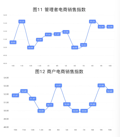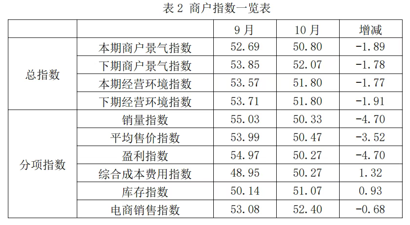 从商户景气指数来看,总指数中,10月商户景气指数为50.80,较上期下降1.89个百分点;经营环境指数为51.80,较上期下降1.77个百分点。