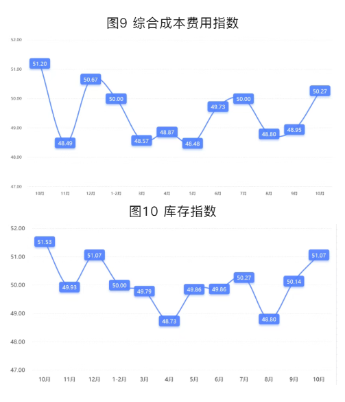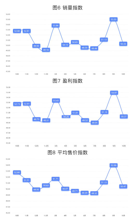 分项指数中,销量指数为50.33,较上期下降4.70个百分点;平均售价指数为50.47,较上期下降3.52个百分点;盈利指数为50.27,较上期下降4.70个百分点;综合成本费用指数为50.27,较上期上升1.32个百分点;库存指数为51.07,较上期上升0.93个百分点;电商销售指数为52.40,较上期下降0.68个百分点。