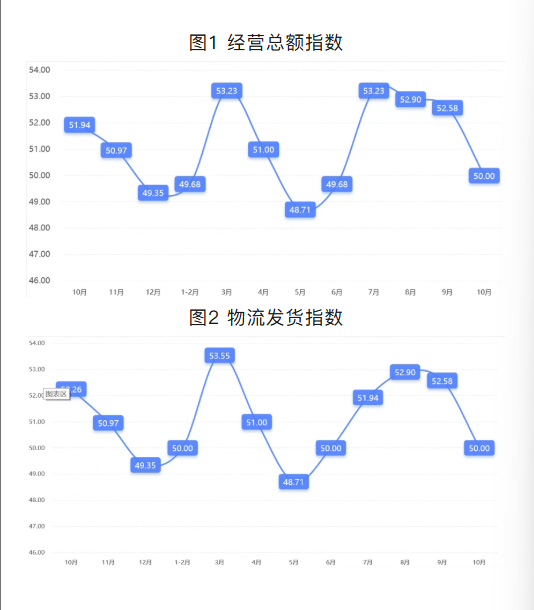 10月,经营总额下降的市场占比12.90%,较上期上升12.90个百分点;物流发货量下降的市场占比12.90%,较上期上升12.90个百分点。两项指数虽然下滑,但仍然高于50,市场经营业绩整体保持稳定向好。