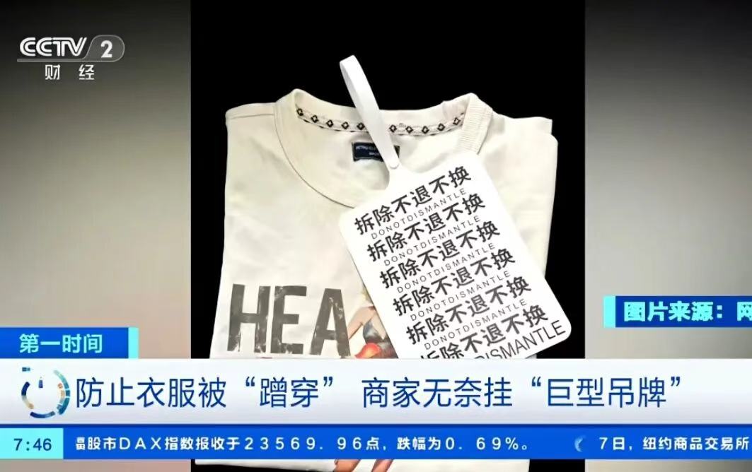 商家使用“巨型吊牌”的意图十分明显,就是防止蹭穿。部分消费者网购服装后,不摘吊牌也不确认收货,穿新衣外出、打卡、旅游等,再在七天无理由退款的时间节点之内退货。商家收到带有香水味、粉底液残留的退货后苦不堪言,这种情况在法定假日前更加严重。许多商家表示,遇到一次性下单多件同款的订单就会更加无奈,多数情况是集体购置团体活动服装,穿过一次之后就会再批量退回。被一次性大批量退货导致店铺评分下滑的情况屡见不鲜,而“巨型吊牌”正是万分无奈之下的产物。从平台热议的消费者反馈看,多数理性的消费者能够理解商家的做法,并表示希望这种方式可以降低普通消费者收到别人穿过的“二手新衣”的概率。但也有消费者认为巨型吊牌影响试穿,甚至担心定制和悬挂“巨型吊牌”的成本会转嫁到普通消费者身上。