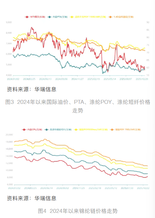 展望全年,化纤行业运行压力依然存在,但在“反内卷”背景下,产能产量增长趋缓,行业供需结构有望持续改善,筑牢平稳运行基础。原料端:在OPEC+退出减产、需求总体温和的背景下,油价中枢整体下移;但考虑到累库幅度不及预期等现实因素制约,四季度或延续震荡局面。化纤主要原料供应充足,预计价格低位盘整。供给端:行业库存总体上暂无明显压力,叠加年末备货预期及外贸环境缓和,开工负荷或将小幅提升,市场有望偏暖运行。需求端:季节性因素驱动、对美出口或将修复等积极因素有望推动终端需求局部回暖,但整体增量有限。行业企业仍需加强产品设计开发及场景创新,激活潜在消费力。