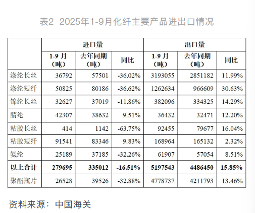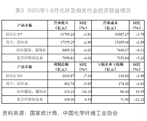 2025年以来我国经济顶压前行,面对外部关税的严峻挑战和内需压力,宏观政策积极发力,稳住了市场预期和信心,前三季度GDP同比增长5.2%,为化纤行业发展奠定了良好的宏观经济基础。前三季度,化纤产量保持平稳增长,库存压力有所缓解,出口增速持续提升,成为行业平稳运行的重要支撑点。经济效益方面,受三季度原料端支撑减弱影响,化纤价格呈现波动向下趋势,导致前三季度营业收入同比下降;但原料价格下滑也为化纤带来利润空间,带动前三季度利润总额同比改善。