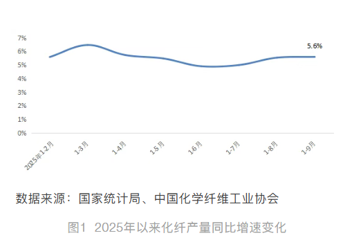 根据国家统计局数据,2025年1-9月化纤产量同比增长5.6%,产量增速较2024年同期和全年均有所放缓,但较1-6月小幅提升0.69个百分点,总体来看基本保持平稳(图1)。