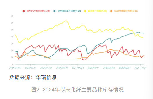 库存方面,涤纶长丝受益于5月中旬企业集中安排停产检修,5、6月库存去化进程加快,7月库存有所回升并在中旬达到26天(以POY为例),此后呈现震荡下降趋势,10月末降至9天(图2)。锦纶库存大幅增加,虽然二、三季度减产幅度扩大,但仅是减缓了库存上升的速度,10月末升至46天。氨纶库存则延续2024年下半年以来的高位震荡态势,上半年基本维持在50天左右;7月下旬库存出现下降趋势,10月末降至40天。