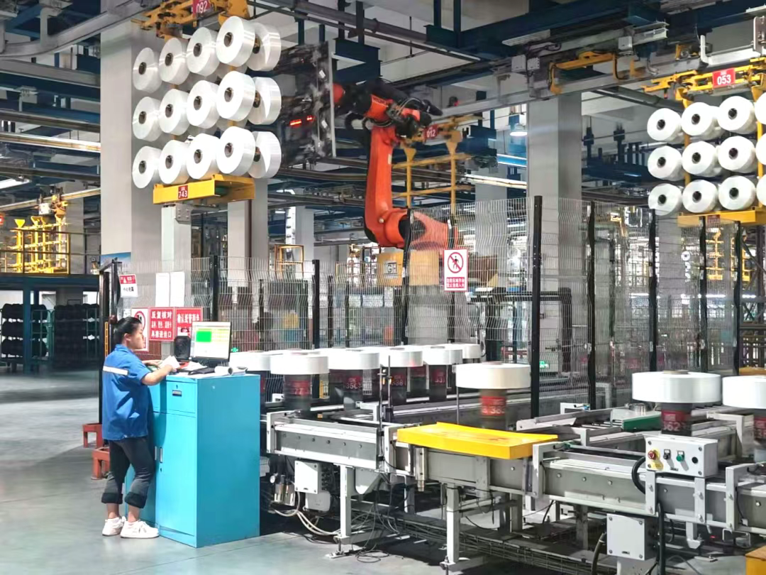 走进新疆宇欣新材料有限公司的生产车间,看不到传统纺织厂“漫天飞絮、机器轰鸣、人来人往”的景象,却有着满满的科技感:一排排现代化纺织设备高速运转,自动检测系统实时监控着每一根纱线的质量,一块块屏幕上跳动着各种数据情况……