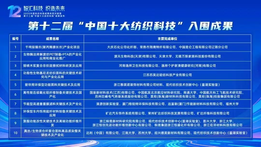 活动现场隆重发布了第十二届“中国十大纺织科技”成果。经过征集与层层遴选,“功能纳米纤维材料低碳产业化成套技术装备创制与应用”等10个项目获评第十二届“中国十大纺织科技”成果;“千吨级臻丝(聚丙烯腈长丝)产业化项目”等10个项目获评第十二届“中国十大纺织科技”入围成果。