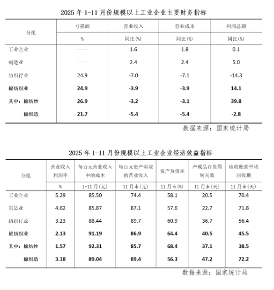 2025年1-11月份,规模以上棉纺织企业亏损面为24.9%,较1-10月份收缩0.8个百分点,继续降至年内最低点,其中棉纺纱亏损面为26.9%,较上月收缩0.9个百分点,棉织造亏损面为21.7%,较上月累计收缩0.7个百分点,棉纺纱和棉织造亏损面均继续收缩至年内最低点。