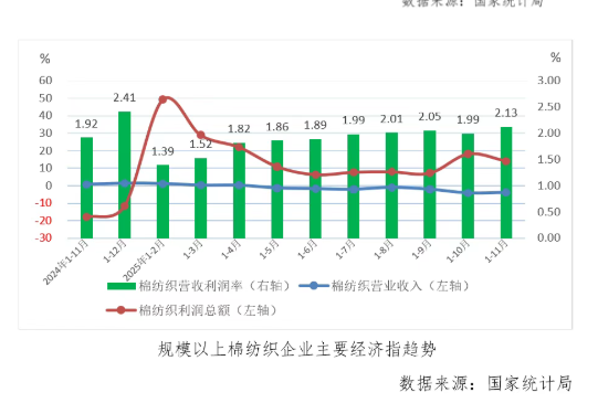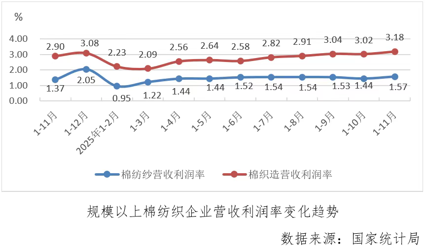 2025年1-11月份,规模以上棉纺织企业营业收入利润率为2.13%,较1-10月份增长0.13个百分点,升至年内最高点,其中棉纺纱利润率为1.57%,较上月累计扩大0.13个百分点,棉织造利润率为3.18%,较上月累计扩大0.16个百分点,棉纺纱和棉织造的营业收入利润率均升至年内最高点。