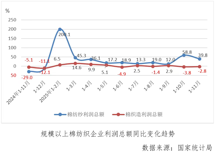 2025年1-11月份,规模以上棉纺织企业利润总额同比增长14.1%,增速较1-10月份收缩4.1个百分点,其中棉纺纱利润总额增速为39.8%,低基数下今年以来持续保持同比较大幅度正增长,增速较上月累计收缩19.0个百分点,反观棉织造利润总额同比下降2.8%,较上月累计降幅收缩了1个百分点。