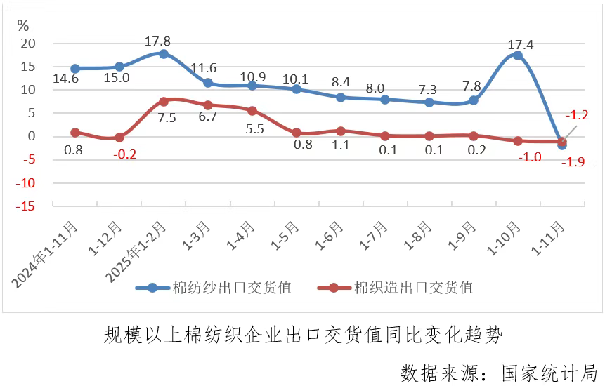 2025年1-11月份,规模以上棉纺织企业出口交货值同比下降1.4%,年内累计首次转为下降,其中棉纺纱下降1.9%,年内累计首次转为下降,棉织造累计同比下降1.2%,延续上月累计下降趋势。